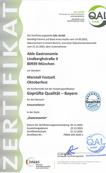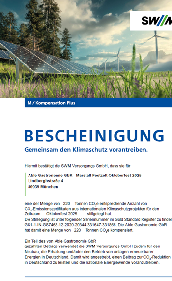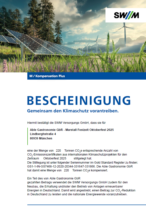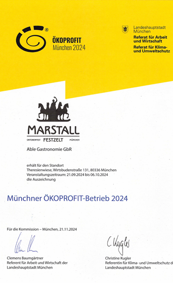 Das Marstall Festzelt hat das Ökoprofit-Zertifikat, das Bayrische Umweltsiegel für das Gastgewerbe sowie das Umweltprädikat für Festzelte erhalten, welches die Umsetzung von Maßnahmen zur Nachhaltigkeit und Umweltschutz bestätigt.